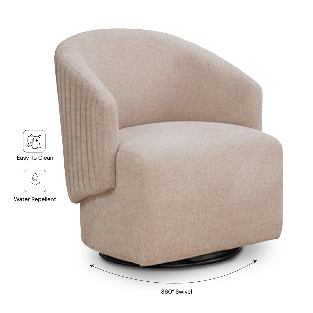A stylish lounge chair crafted with solid wood, high-density foam, and fabric upholstery in light taupe. Features 360-degree swivel, easy-clean, and water-repellent fabric for lasting comfort and convenience.