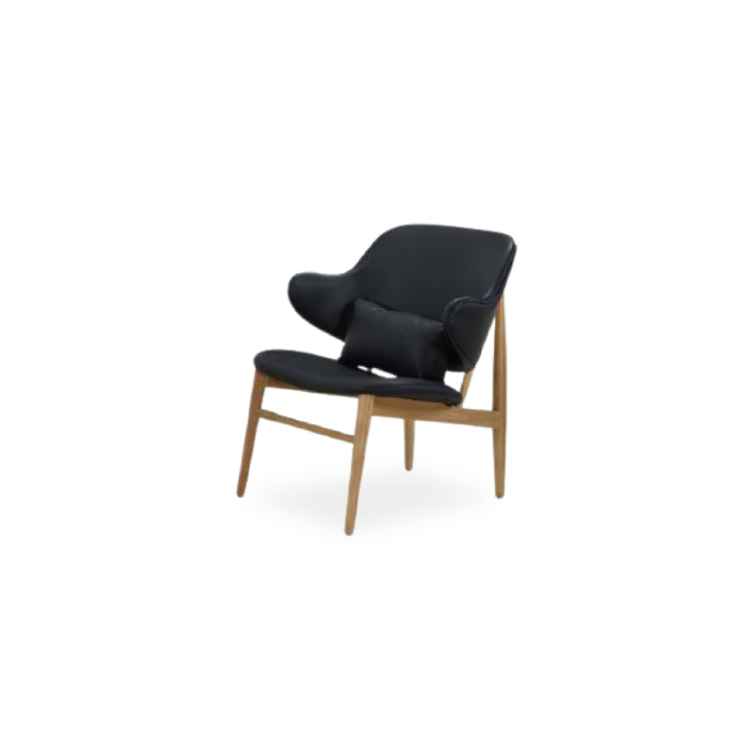 Lounge chair with a solid rubberwood frame in natural oak and a black PU leather seat. Combines classic warmth with a modern edge—ideal for reading corners, home offices, or stylish living spaces.