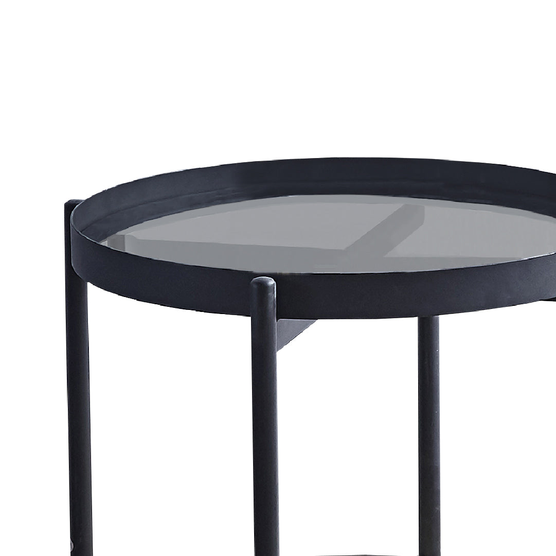 A stylish blend of modern and natural textures, featuring a smokey tempered glass top, a second tier in durable polyethylene rattan, and sturdy black powder-coated steel legs. Perfect as a functional accent for contemporary living spaces.