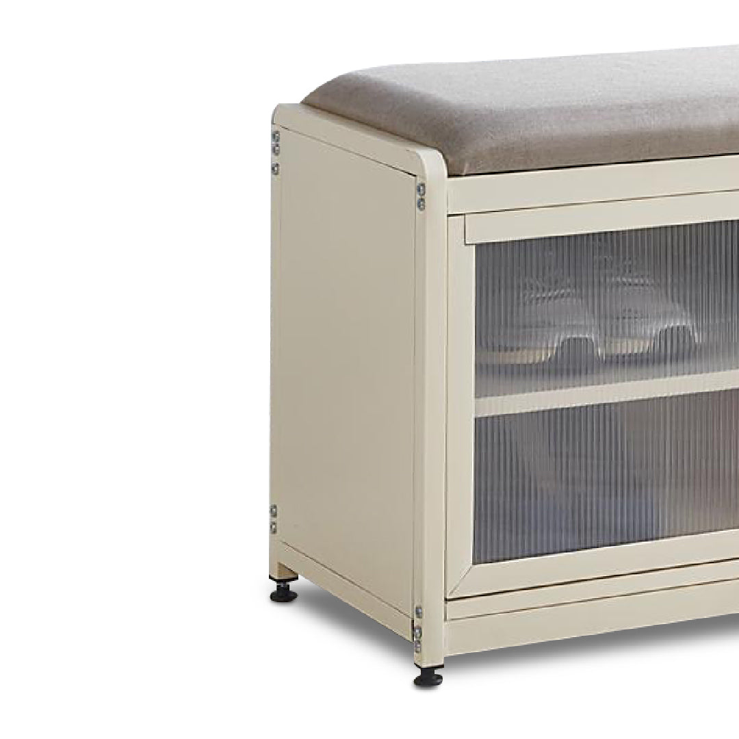 A compact shoe cabinet with a laminated particle board top, sturdy metal body, and plastic door. Designed with 2 shelves for practical storage, finished in a modern white cream tone.