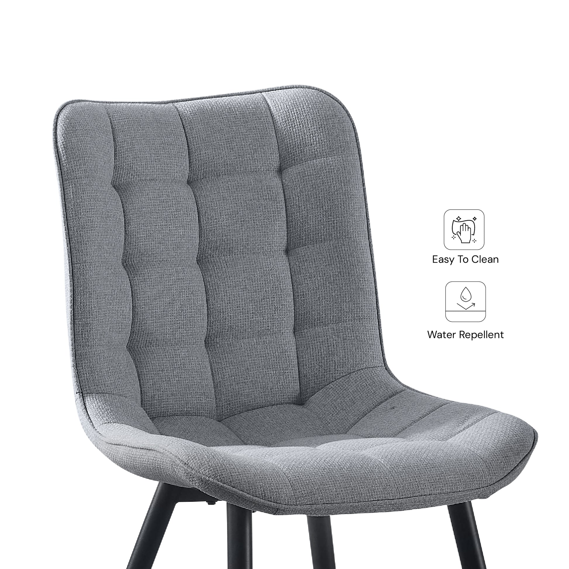 The Finella Dining Chair features a fabric seat with black powder-coated metal legs for a sleek, modern look. Its easy-clean, water-repellent fabric makes it practical for everyday use, while the dark grey tone adds a touch of elegance to any dining space.
