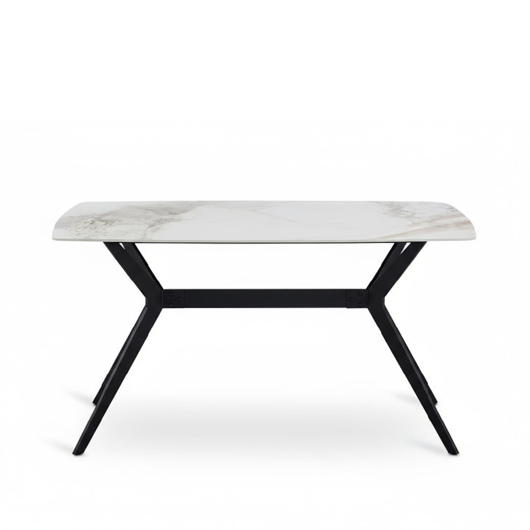 The Rigasa Dining Set includes a stylish sintered stone dining table with black powder-coated metal legs, paired with four dark grey PU fabric chairs on matching black metal frames—a perfect blend of modern design, durability, and comfort for everyday dining.