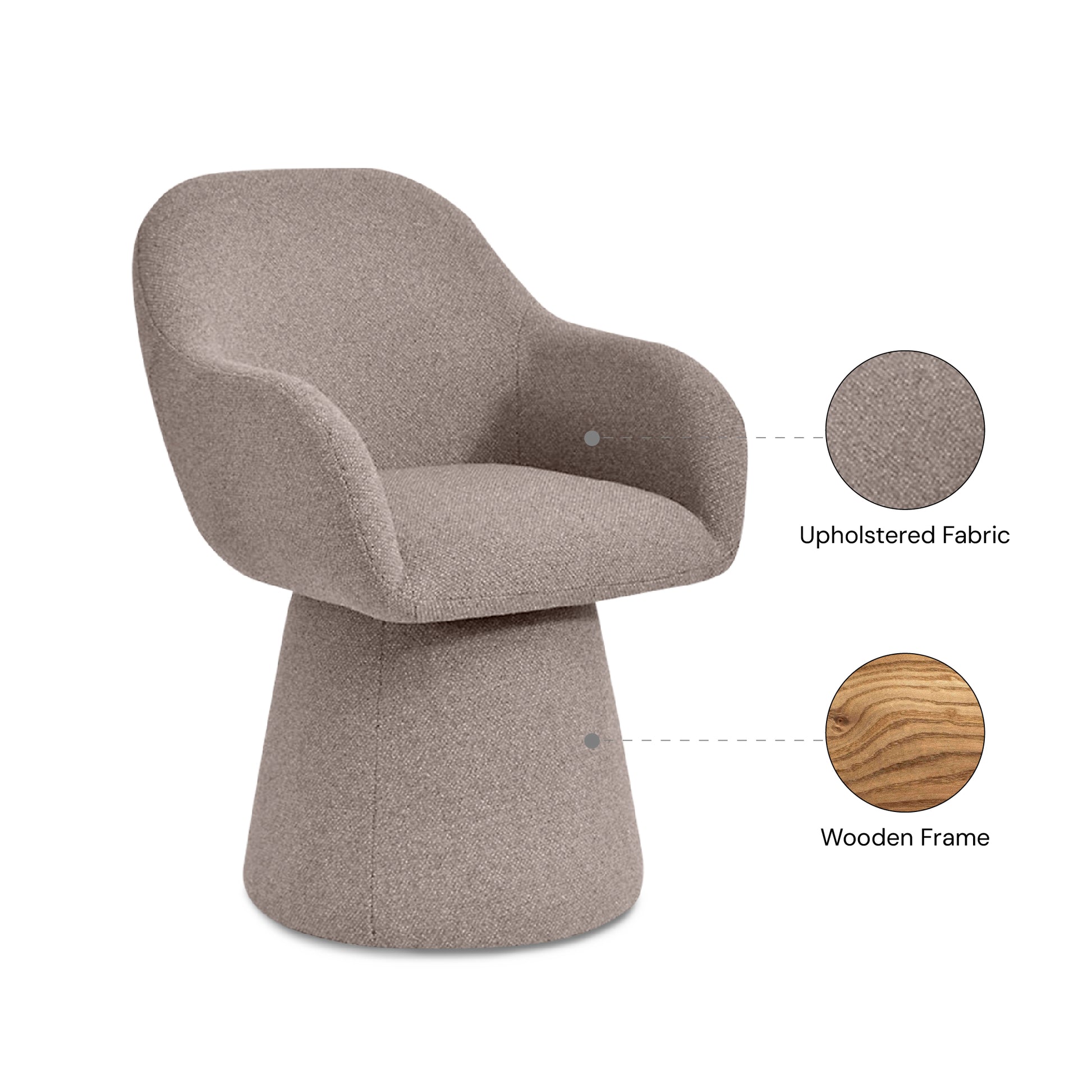 The Wennie Swivel Arm Chair in taupe brown combines comfort with functional style. Built with a sturdy wooden frame and upholstered in soft fabric, it offers a cozy seating experience. The 360° swivel feature adds flexibility and ease of movement, making it a perfect choice for modern living spaces.